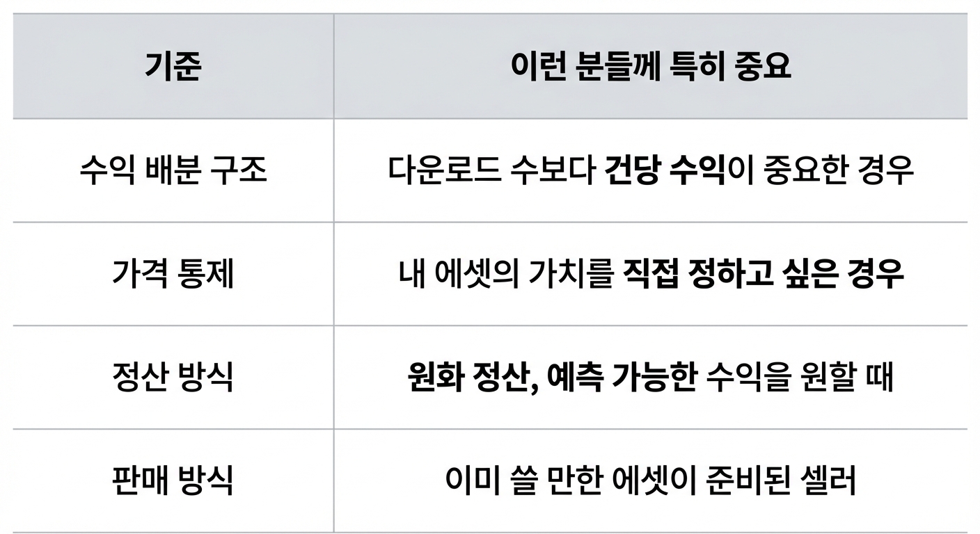 이미 만들어둔 에셋을 활용하는 판매에 더 어울리는 방식이죠.